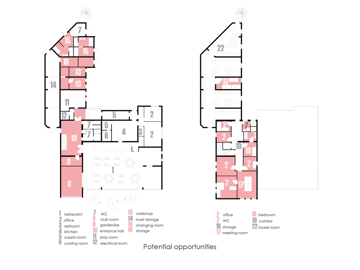 As an additional benefit, new boat-like cabins were added to the rooftop. It helped to free up space in the main building for additional storage and a more comfortable lounge room. Cabins imitated boats which helps to add more rooms and reduce the loads on the walls of the main building. Also cabins can be used as an additional source of income for the club.
