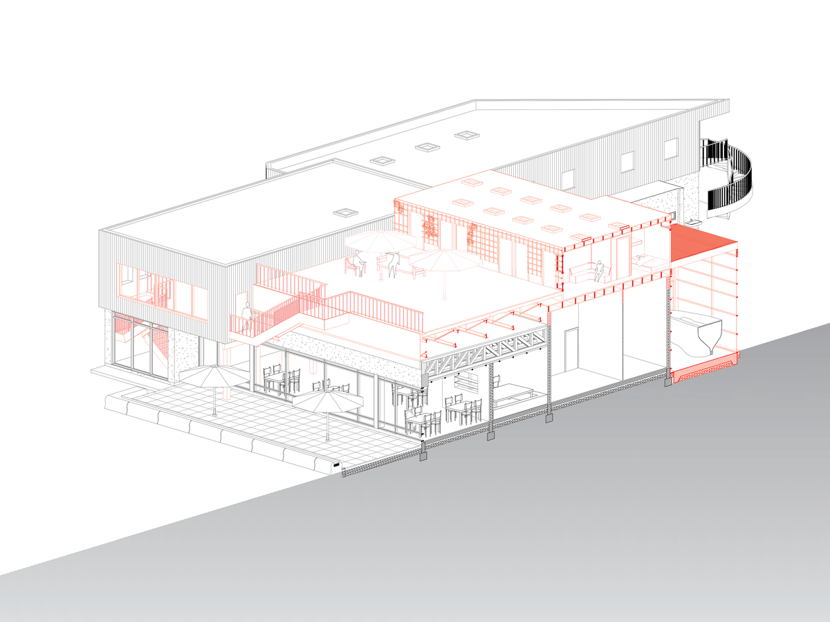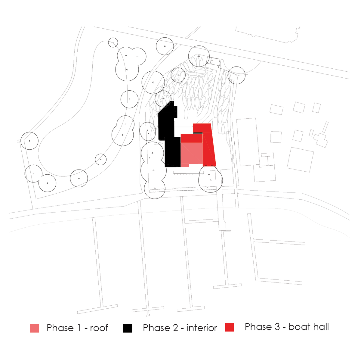 We also connected workshop with the main building by adding new staircase in the restaurant and new roof terrace. The terrace load bearing structure integrates well with the structure of the boat-hall and doesn’t completely shut down the functioning of the restaurant - the heart of the club.