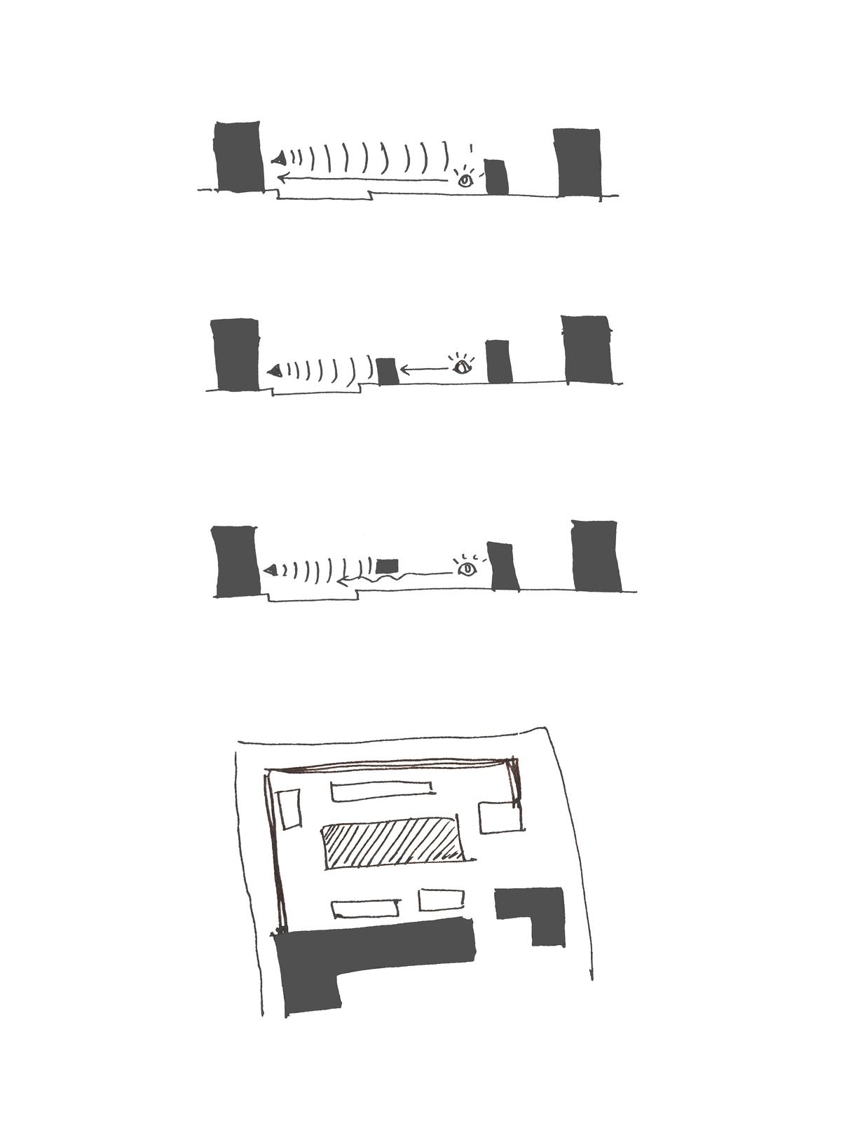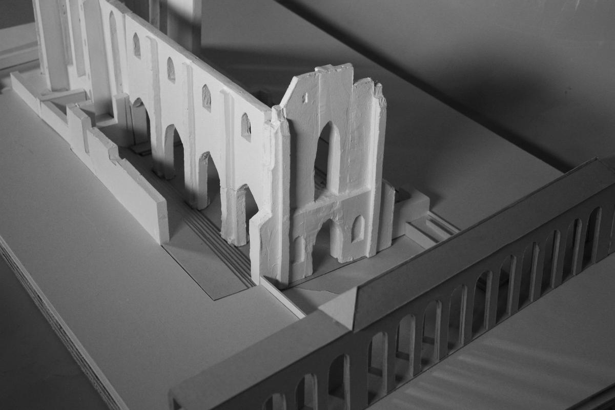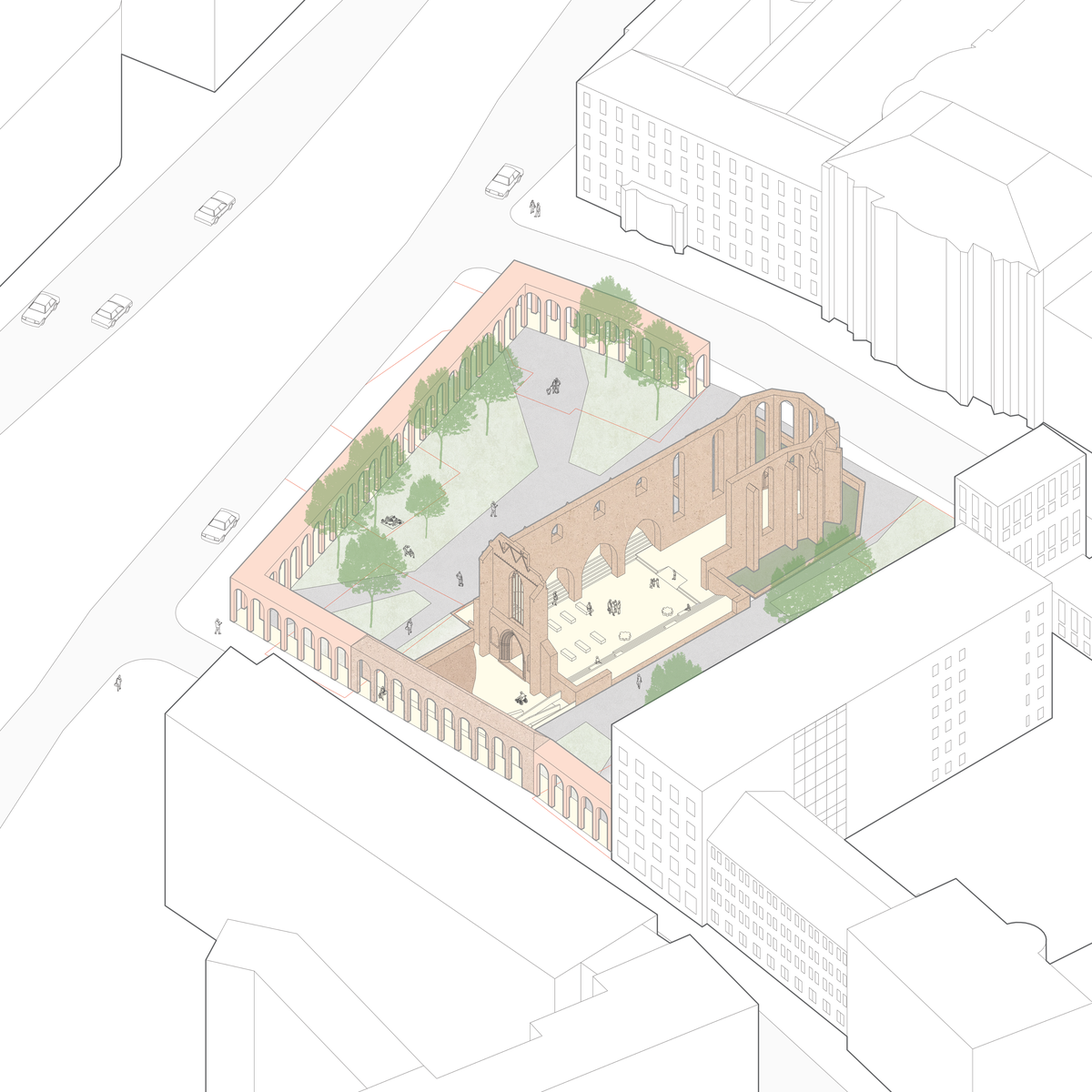 A reconstructed corner of the church is removed to create a clear and continuous flow through the ruin, reconnecting it with surrounding paths and allowing visitors to move naturally across the site.