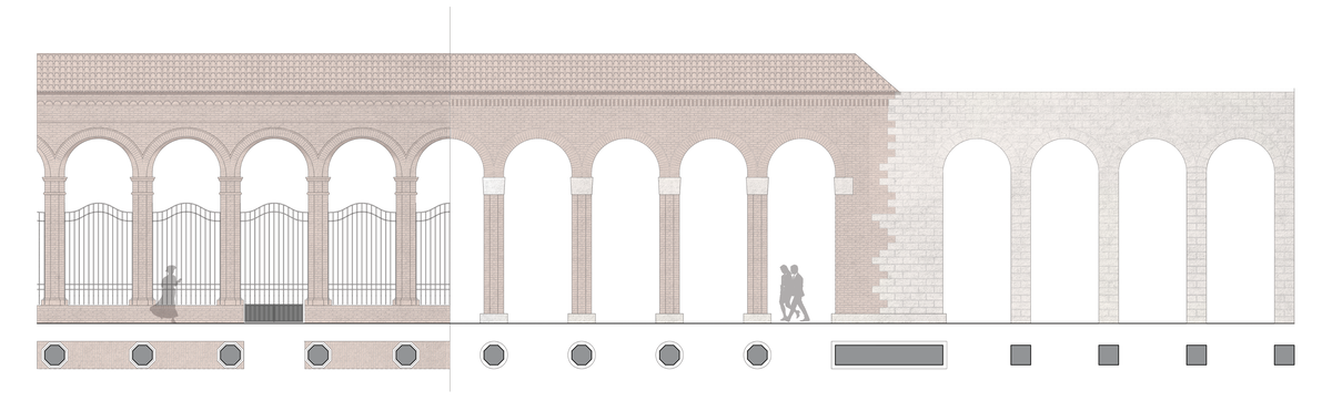A new colonnade reinterprets the historical arcade once present on the site, extended beyond its original footprint, it becomes a contemporary addition that continues the narrative of the place.