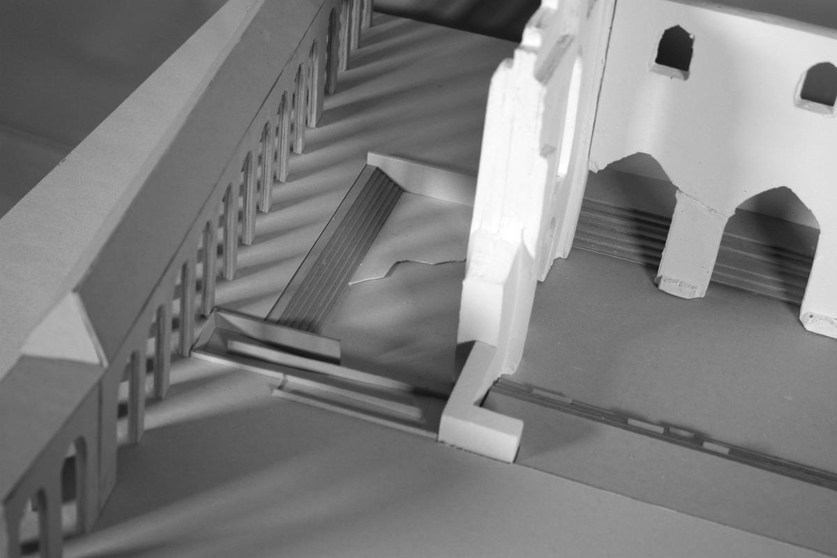 This project responds by reorganising the ground and introducing a light architectural frame that reconnects the ruin to its surroundings without touching it. Through these subtle interventions, the site becomes accessible and inviting again.
