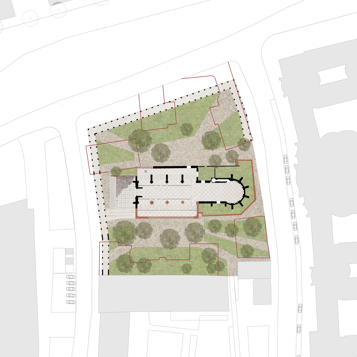 The main interventions connected directly to the church focus on opening the site, improving accessibility, and making the historical layers visible again, beginning with the removal of the fences that once enclosed the area.