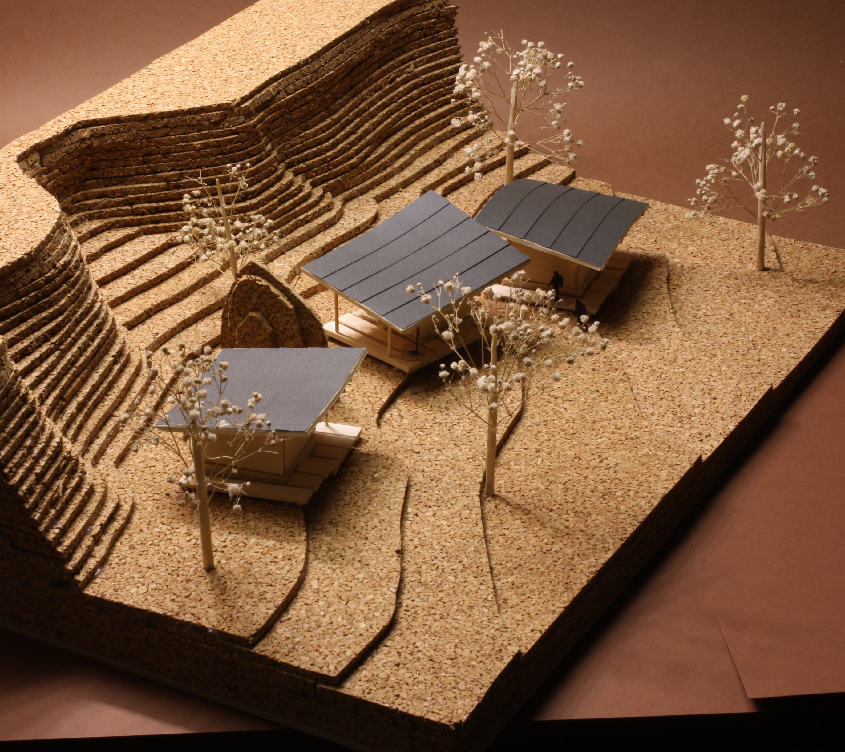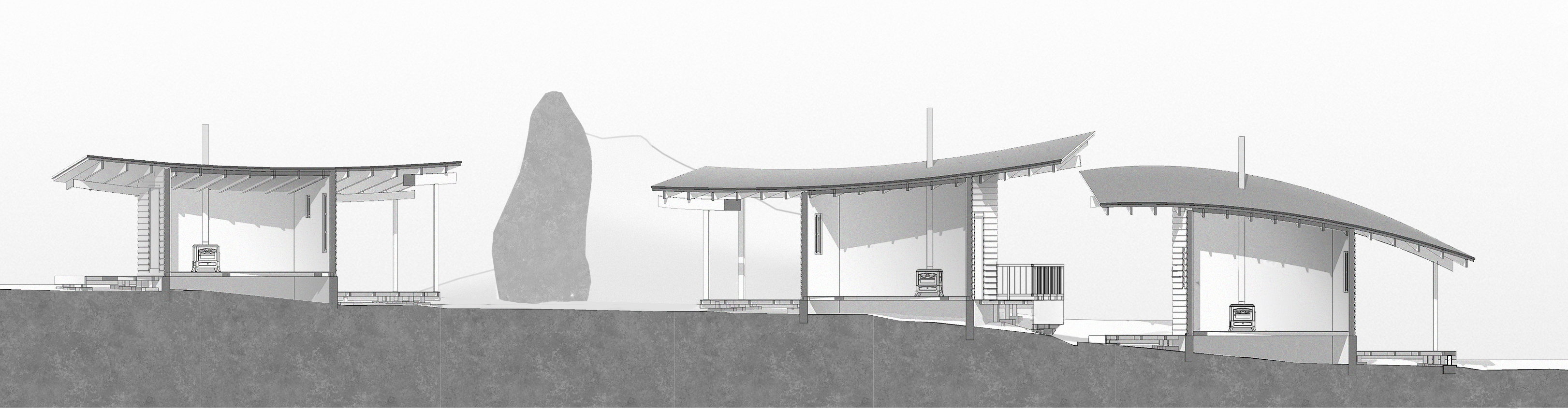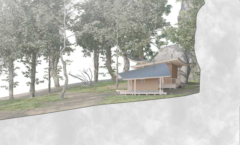 The magic created by the surrounding rocks and my choice of materials made me think of japanese theme for its organic blend with nature and exquisite use of woodwork. It also has an interesting resemblance with traditional georgian architecture.