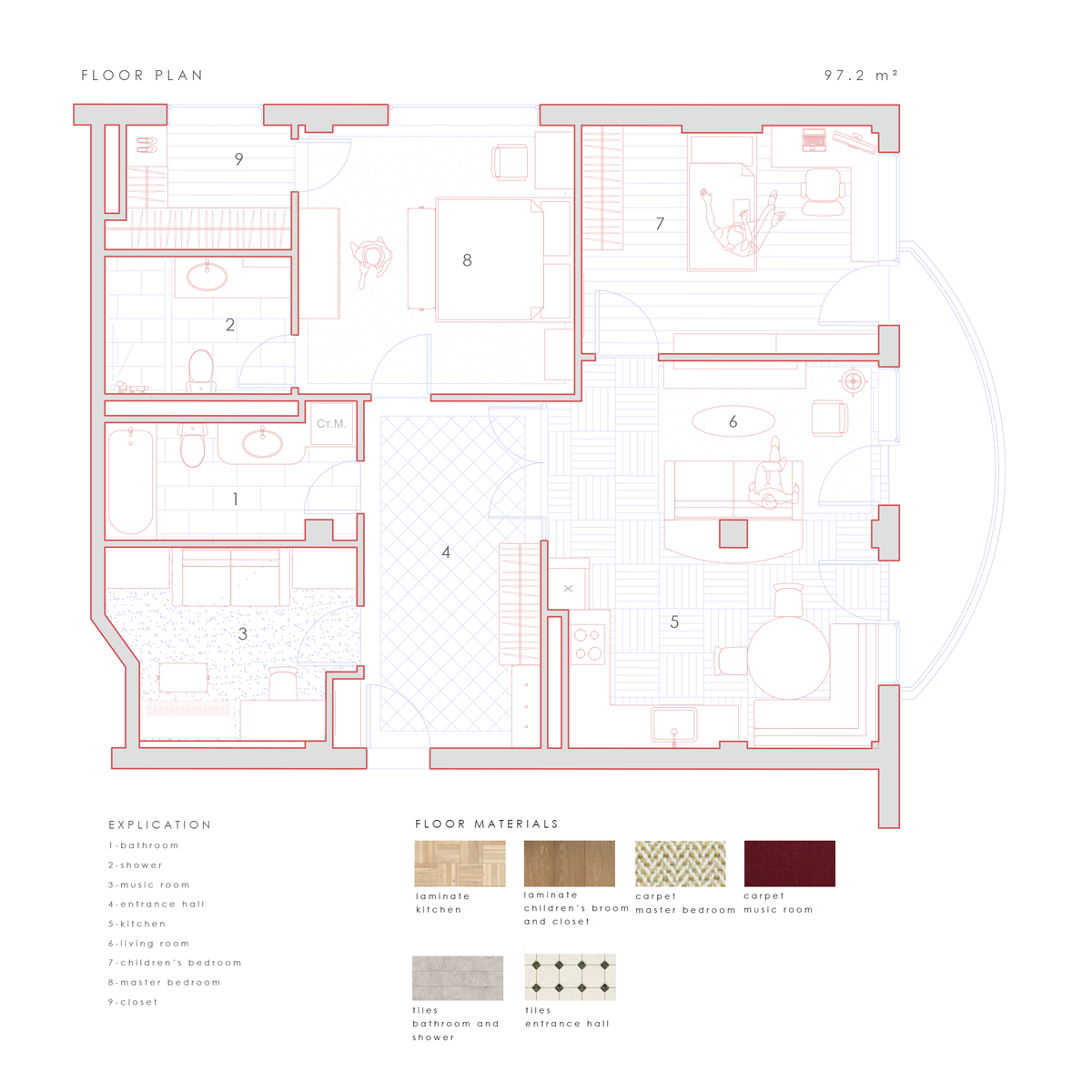 To define the requirements for the apartment layout, it was first necessary to establish a clear profile of its future occupants. In order to make the project more realistic, the apartment was designed for a family of three: a couple with a daughter aged between 10 and 13 years.