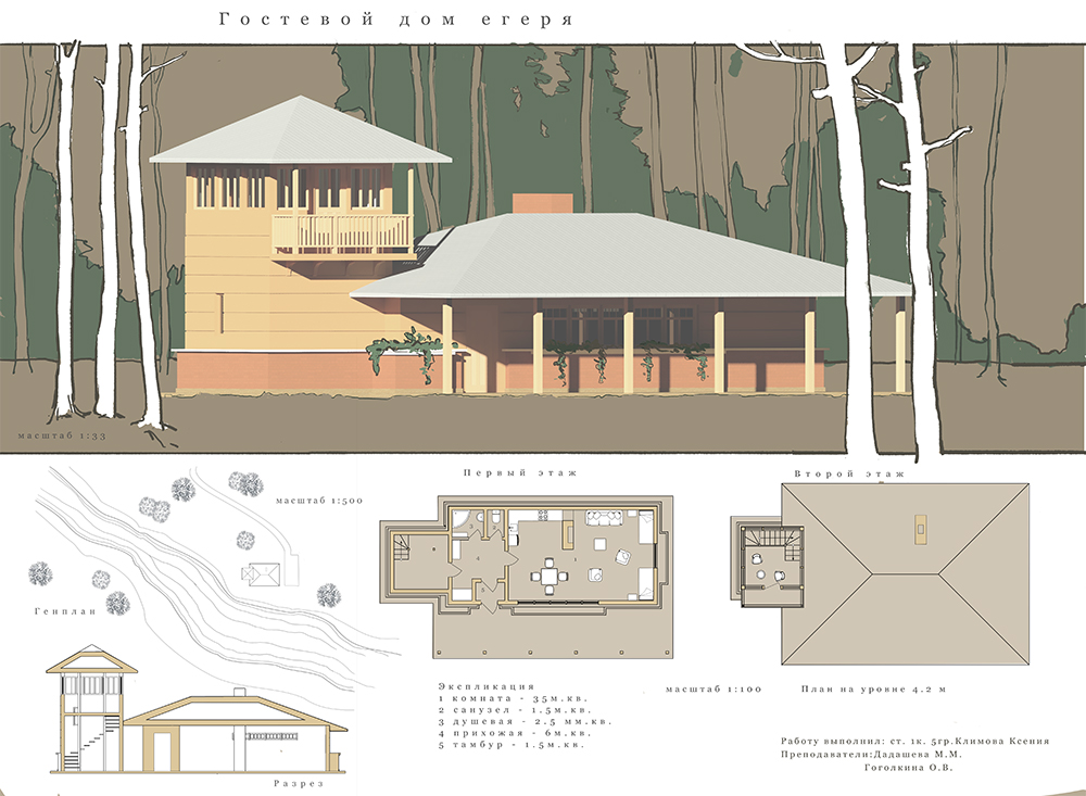 Design a one-story house for temporary residence of a small group of hunters or fishermen (up to 4 people). There should be a separate space for storing outerwear and equipment in the entrance hallway. The house should have a terrace or cold veranda and an optional observation tower.